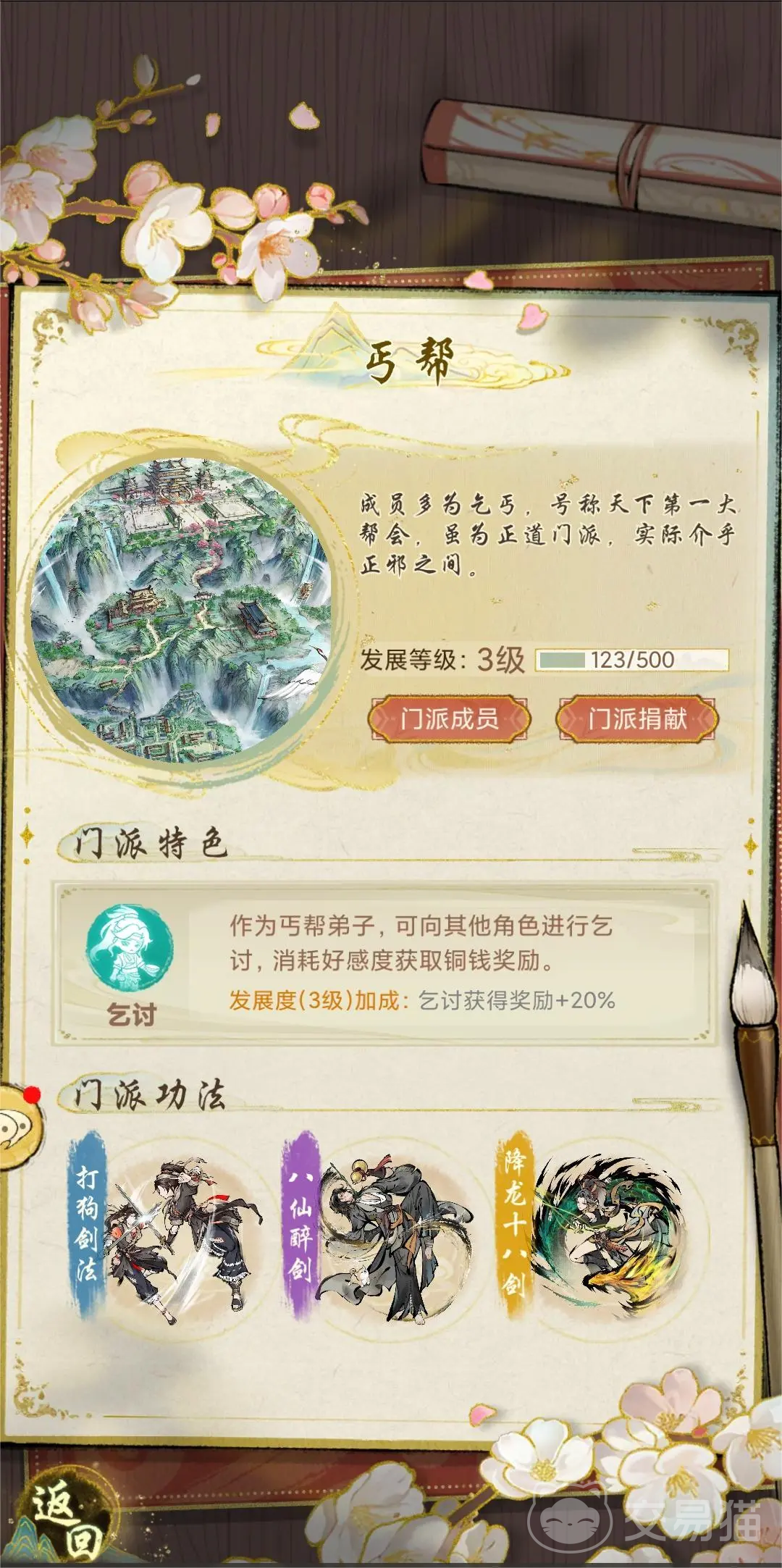 独特的乞讨机制可稳定获取铜钱资源,前期实现角色的快速养成,专属武学“打狗剑法”能降低敌人命中率,干扰对手节奏,也是非常适合新手或注重经济循环的玩家使用的,若大家是选择的选择“名门望族”出身,配合丐帮的资源积累,可形成不错的经济链,轻松升级心法与装备,过剧情和打怪也能更省心。