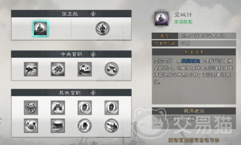 最后的雷以国家策略为特点,担任不同的官职才能解锁出不同的兵法技,这些技能往往有一定的冷却时间限制,但效果都十分强大,比方说“空城计”可以不论城防军情况,强制保留一段时间的城池归属,“以逸待劳”能让我方一座参战的城池,在结束战斗后立刻补充一次兵力。