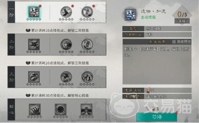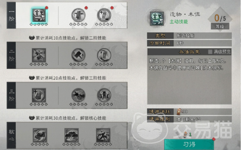 林以增加战斗队伍和长期战斗为特点,可以创造出道具“木偶”,帮助在队伍战败时对敌方造成伤害,提升到3阶,可以学习战功增加、士气回复等战斗辅助机,提升到核心可以召唤出攻城车对城池进行攻打,火以战斗和进攻为特点,可以创造出道具“战鼓”,提升到2阶可以直接消灭敌方城池中的城防军,三阶能帮助在战斗中恢复兵力,解锁到核心可以直接锁定敌方战力最强的队与其战斗。