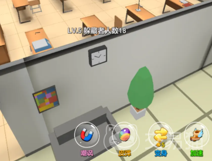 这里还有不少道具可用,例如皮弹(烟雾弹),使用后可以制造烟雾干扰视线,躲藏者可用来搭建踏板跳至高处,但注意拖尾可能暴露位置。还可使用3D声音口哨,用了后能找嘲讽寻找者,可模仿放屁、狗叫等声音,但短音效难定位,慎用。另外还有问号标记,可以显示一名躲藏者的伪装形态,寻找者捡到后0.1秒内识别对应物品,需熟记图鉴。也可使用炸弹范围攻击可疑区域,寻找者用来清理密集物品堆(如仓库角落)。