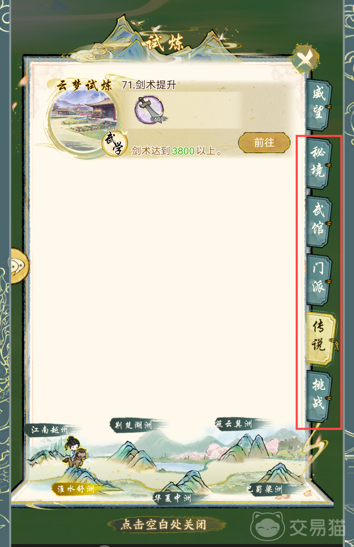 各城市有“算盘标志”的隐藏商人,可兑换紫色外功(杭州、开封、洛阳轮流刷新)。循环路线的话,就是杭州(辰时)→开封(午时)→洛阳(酉时)。奇遇任务奖励方面的话,可获得稀有武学(如《青莲剑歌》)、悟剑丹(用于突破武学等级)、剑意(升级内功/外功的关键材料)、NPC好感度(解锁特殊剧情或同行功能)。这些道具都很好用,可以提升大家的战力,并解锁全新的道具材料。