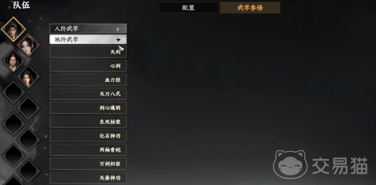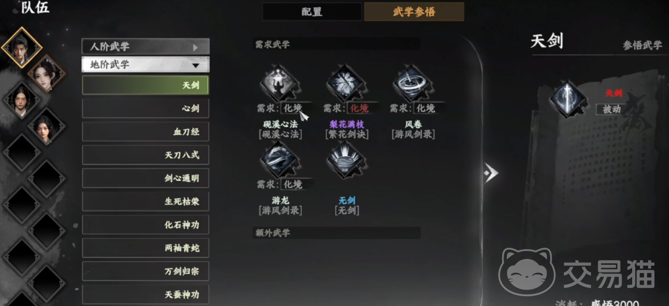 玩家们可以在武学参悟中查看地阶武学中的天剑,天剑武学的需求武学一共由五个,分别是砚溪心法、梨花满枝、风卷、游龙和无剑,玩家们需要将其全部收集齐才能参悟天剑武学,首先是砚溪心法,这个心法是任务完成直接给的,只需要加入了砚溪山庄,玩家们就自动获取这个心法,游龙和风卷得到的时间节点会很早,在新手时期的时候就可以得到,新手时期玩家们经历过的地宫里,就有这两本心法。
