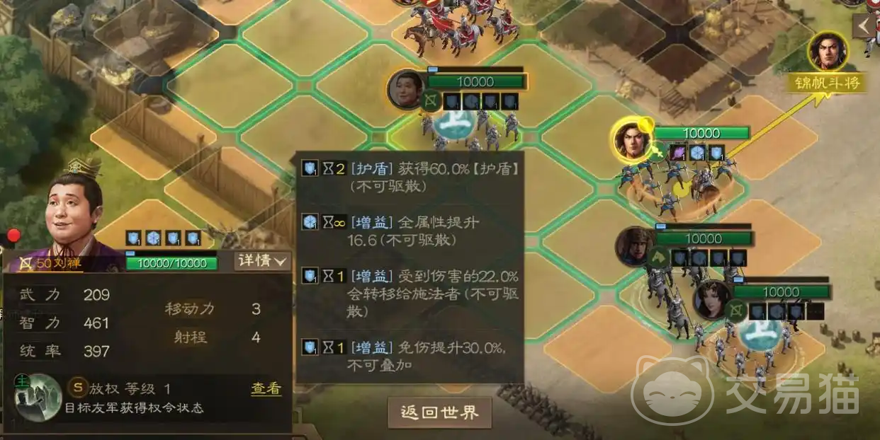 自带战法可无视地形的阻挡,直接位移到队友的位置处,如果友军身边没有位置则不可使用,之后给自己1格范围内的友军全体分摊伤害,能承受22%伤害;同时给己方队伍附加60%“护盾”效果,根据武力提升护盾影响;还让免伤提高30%。
