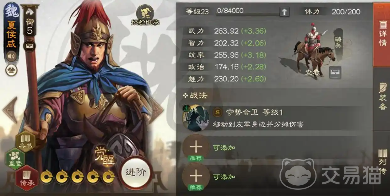 他是魏国5御骑兵,2.06的智力成长,3.36的武力成长,水平中上,统率成长3.18,数值相对比较均衡。作为坦克而言,骑兵其实是这个武将的劣势,现在能转变兵种,但是转阵营和兵种只能二选一,如果已经转换阵营,只能通过西凉铁骑来增强自身的坦度。