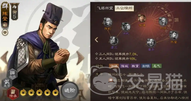 该能力可以为我军单体恢复兵力,并使得目标的移动力加2,持续一回合,他的羁绊为“三让徐州”,该羁绊可以和陈登等下图角色进行组队,三人同队可以让统率提升7%,五人同队可以让统率提升16%,他的特性也比较普通,为支援、诡计等,没有橙色特性。