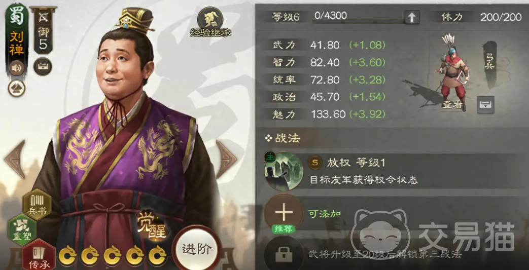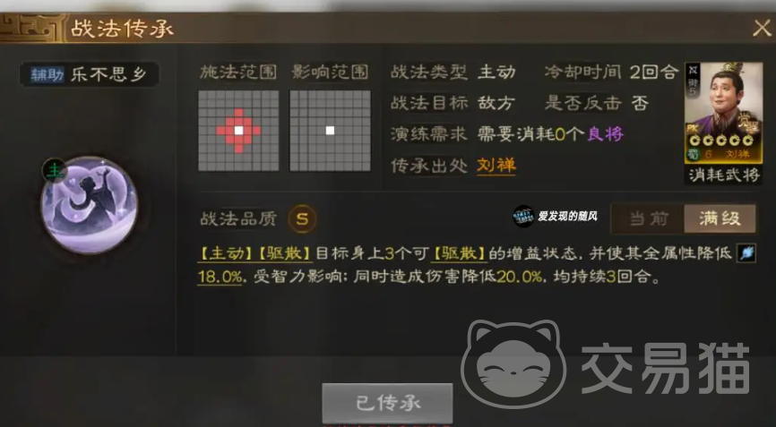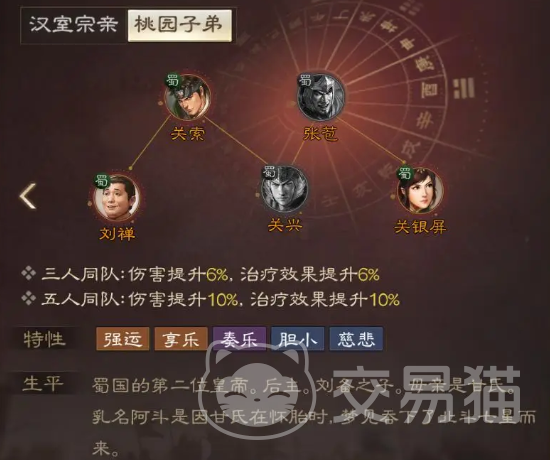 他的传承“乐不思乡”会驱散掉敌方目标身上的三个增益状态,并使得其全属性降低,同时造成伤害降低,这些效果均会持续三回合,可被驱散,他缘分有“桃园子弟”、以及“汉室宗亲”。