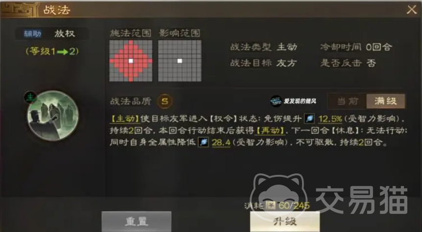 刘禅的战法“放权”会让目标队友进入到“权令”状态之中,在该状态下会得到受智力影响的免伤提升效果,维持2回合,本回合行动结束后还会获得“再动”,但下回合会造成无法进行行动的休息,同时自己的全属性会降低2回合。