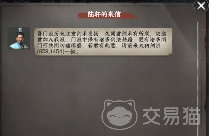 要想加入太初剑中就需要满足50剑术的基本要求。接下来就会收到飞鸽传说,然后邀请玩家前去叙旧。玩家可以找到陆轩这里就有一个入门拜师的选择。接着还有一个支线任务需要去处理剿匪,根据任务可以选择接下来的对话。无论选择哪一个对话都不会影响结果,一旦在打败敌人之后就可以触发一个全新的剧情,接下来就可以开启门派生涯。想要从外门弟子进入到内门弟子,那玩家就需要来到事务总管这边接取悬赏的任务。在完成悬赏任务之后就可以改变。