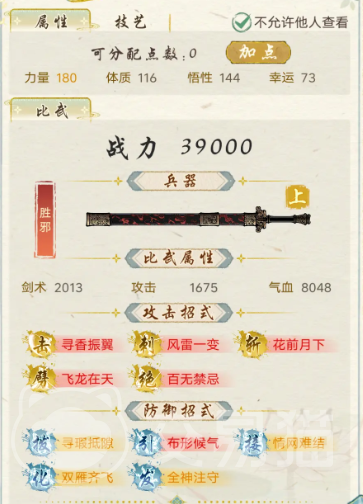 例如如果用剑法就着重提升剑术,若是用刀法,则全力钻研刀法,这一阶段的目标是将输出能力推向极限,使角色在战斗中能够爆发出更强的力量,特别是对于追求极致输出的玩家来说,全幸运加点配合太乙玄门剑的独特分阴阳效果,将成为初期最强的搭配,除了上述针对人物属性的加点策略外,功法加点同样不容忽视,尤其是剑术与内功之间的平衡把握。