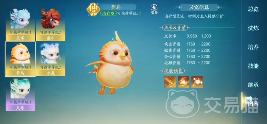 黄鸟也是很多小伙伴会选择的宠物,它的核心技能能够提升10%的防御冷却时间只有15秒,虽然黄鸟和灵尊都是辅助类型的宠物,但其实黄鸟的搭配率会更高一点,适合多个职业使用,因为无论是哪个职业,多点防御力总是好的,所以如果前期小伙伴们不是很熟练的时候,建议搭配这个宠物,给自己的战斗提升容错率。