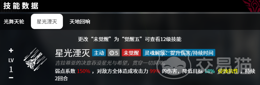 而星光湮灭则是她在觉醒五阶段解锁的强大技能,其弱点系数是达到了150%的数值,能够对敌方全体造成攻击力99%的巨大伤害,使用的时候除了上面的效果之外还会降低目标18%的侵蚀抗性,持续2回合之久,进一步削弱了敌人的抵抗能力,但是因为五觉的要求是比较高的,所以这个技能可能会在偏后期的时候解锁。