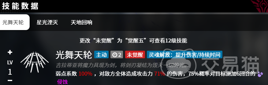她的主动技能叫做光舞天轮,施展此技能时,不仅能够提升自身的伤害输出和持续时间,还能对敌方全体造成相当于攻击力71%的伤害,且该技能拥有高达75%的概率使目标陷入长达6回合的侵蚀效果之中,在这种状态下,敌人的防御能力将大幅降低,为我方的攻击创造更为有利的条件。