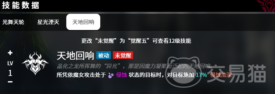 而除了主动技能外,吉拉蒂亚还拥有一个强大的被动技能叫做天地回响,当所凭依的魔女攻击处于抗性-侵蚀状态的目标时,她会施加17%的侵蚀加深效果,随着角色等级的提升,这个技能也会不断进化,当突破等级达到30级时,吉拉蒂亚正式解锁了天地回响技能,并且获得了两项强化后的能力,首先是对于诞生职阶的目标输出的时候伤害会提升8%的数值,另外则是技能的上限会提升5级。