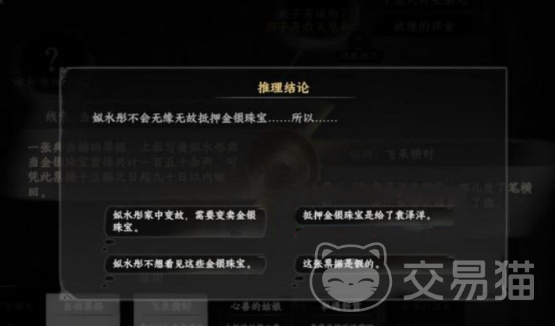 在触发任务之后,玩家们需要先和npc步婶对话,她会要求你前往2楼,帮她寻找掏耳勺,大家到2楼之后看到地上有一个冒着金光的东西,就是她的掏耳勺了。捡起来之后回头去找她,一番对话之后触发一次战斗,会有两名村民向你发起攻击,将他们打败,可从他们的身上获得两枚神秘的药丸。把这两枚药丸交给npc湛初夏,然后前往门口,会有一个叫做长天逸的npc与你对话。你们起了争执,并对他发起质疑,在一番战斗之后,你打败了他,此时系统会向你发送提示,要求你前往指定的地点挖出一具尸体。接下来就会进入推理环节,三个结论中分别要选择的是第一个选项,最后一个选项和左下角的选项。