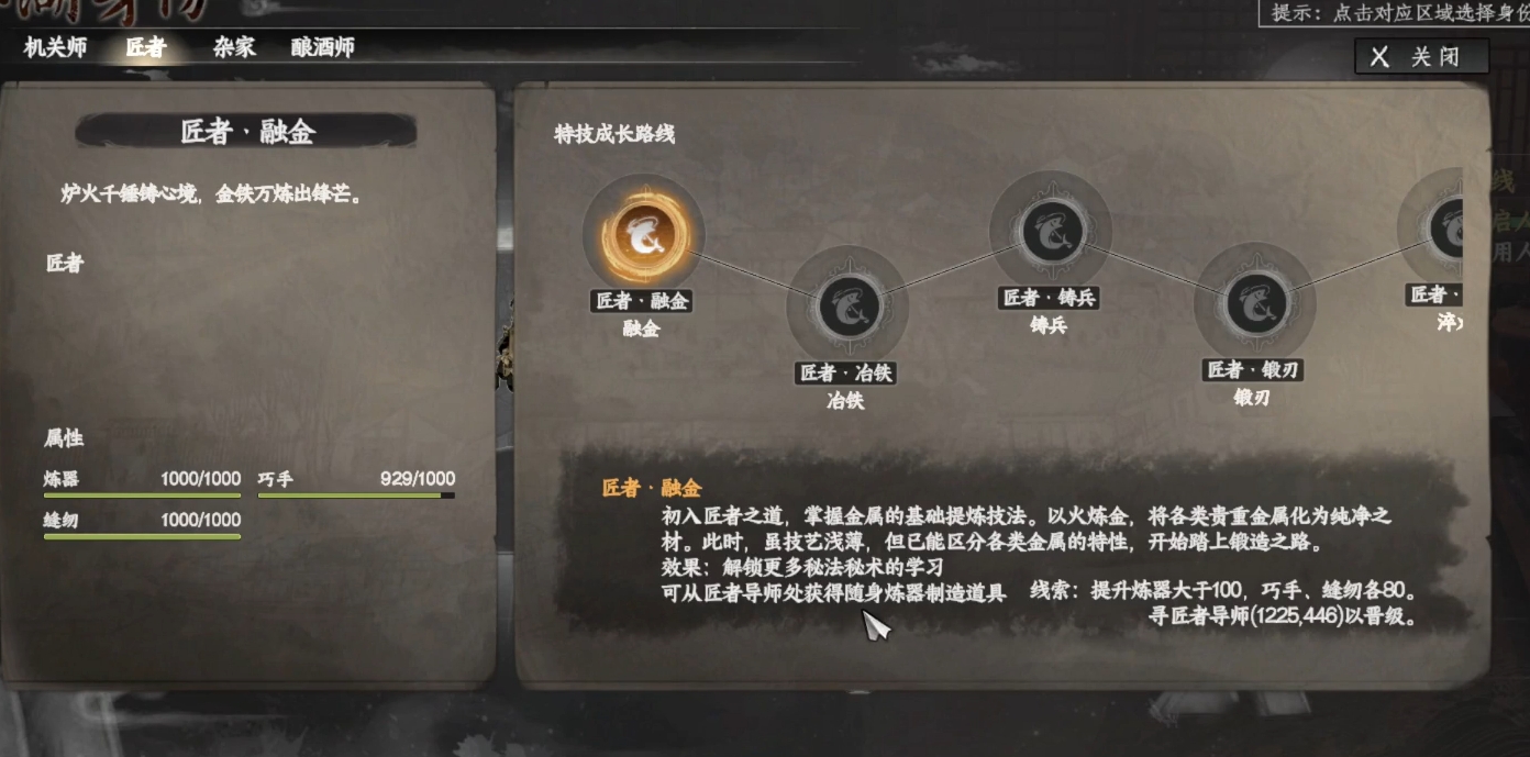 匠者需要找匠者导师加入才能获得该身份,而他的位置也并不难找,各位可先来到齐国的狂刀门,通过地图的点位搜索找到(1226,445)的准确位置,然后来到该点位就能看到自己所想要找的匠者导师了。但在与他交谈前,各位需要先将炼器、缝纫、巧手三项技艺都堆到50以上,否则无法满足满足成为匠者的条件。这三项技艺最快地提升方法就是买对应的秘籍来进行学习,例如巧手秘籍等,很轻松就能将属性堆到要求。