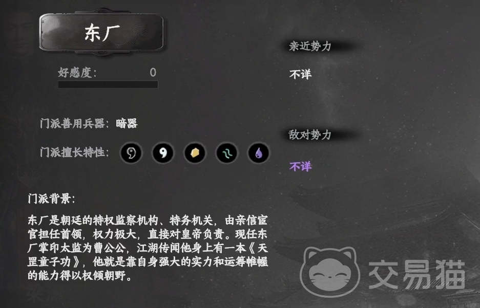 前期就可加入的一个门派,门派核心武器为暗器,且在晋升亲传后,各位就能直接学到暗器武学葵花,是除了唐门外很适合暗器玩家加入的一个门派。要注意加入东厂后无法再加入其它门派,且玩家退出东厂后,无法再通过任何途径回到东厂,所以更建议玩家学完所有东厂所有武学后再退出。