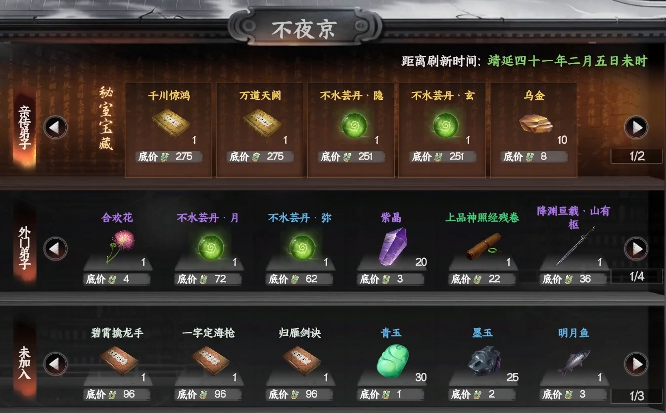 不夜京是中立门派,加入需让兵道属性达到100,枪棍属性达到80,在坐标(1028,328)附近找到赵长歌入门。该门派的特色是不影响玩家加入其它门派,且玩家还能直接在该门派里成为捕快身份,接取任务肃清江湖败类,还能通过贡献拿到千川惊鸿和万道天阙两本金色武学。