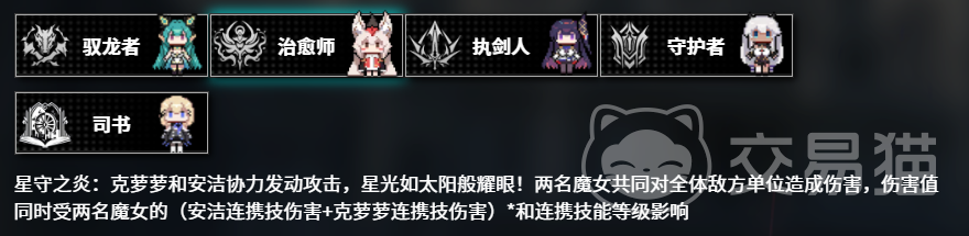 在交叉冲击的特殊效果方面,只要与安洁发起协力一击,便能形成强大的合力效果,两名魔女共同将力量倾泻于全体敌方单位,所造成的伤害值受到多种因素的影响,其中既包括安洁自身的连携技伤害以及其他与之配合的魔女,如律这个角色的连携技伤害,还与双方的连携技能等级相关,例如当克萝萝与安洁携手发动攻击时,会激发出独特的星守之炎效果,她们共同对全体敌方单位展开猛烈打击,伤害计算方式综合考虑了双方的各项属性,使得每一次攻击都充满威力,同样地若安洁与米娅进行组合,也能产生类似的强大效果,两人合力之下效果更强。