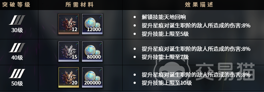 除了上述的主动技能外,吉拉蒂亚还拥有一个强大被动技能叫做天地回响,当只要是攻击处于抗性-侵蚀状态的目标时,她会施加17%的侵蚀加深效果,使敌人变得更加脆弱,随着角色等级的稳步提升,这个技能也会不断进化,当突破等级达到30级这一关键节点时,吉拉蒂亚正式解锁了天地回响技能的全部潜力,并且获得了两项至关重要的强化效果,一是提升星痕对诞生职阶的敌人所造成的伤害8%,让她在面对特定类型的敌人时能够造成更为可观的伤害,二是将技能上限提升至5级。
