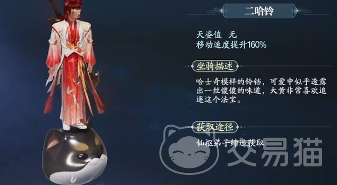 二哈铃是哈士奇形状的铃铛,外表可爱但却透露出一丝丝傻傻的味道,大黄会非常喜欢追逐该法宝类坐骑,想要的可以通过仙枢弟子缔造。