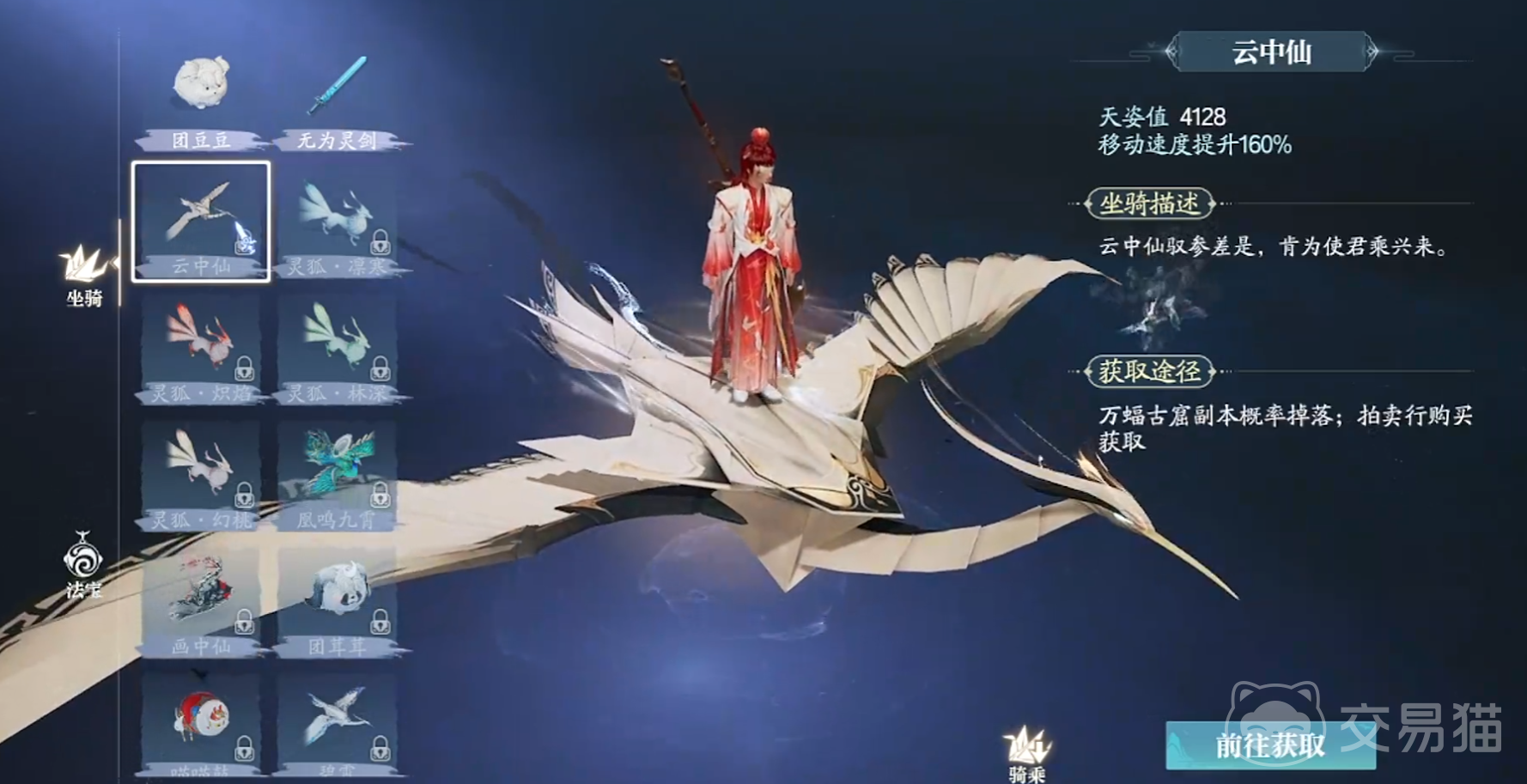 云中仙能让移动速度提升160%,天资值为4128,它的外表像是一只巨大的仙鹤,大家想要可进入万蝠古窟副本中,在这里概率掉落,或者也可以通过拍卖行购买。