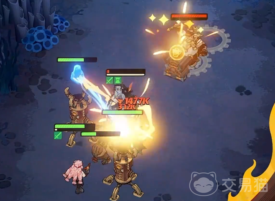 1技能“钢铁防线”,被动情况下,在自己面前建造一座机枪塔,同样继承自身数值,这个塔具备一定攻击距离,会优先攻击范围内最靠近塔身的敌方单位;每当机枪塔进行若干次普攻后,下次普攻改为对敌人进行猛烈打击,打出多段伤害,每发子弹还附带眩晕和击退。