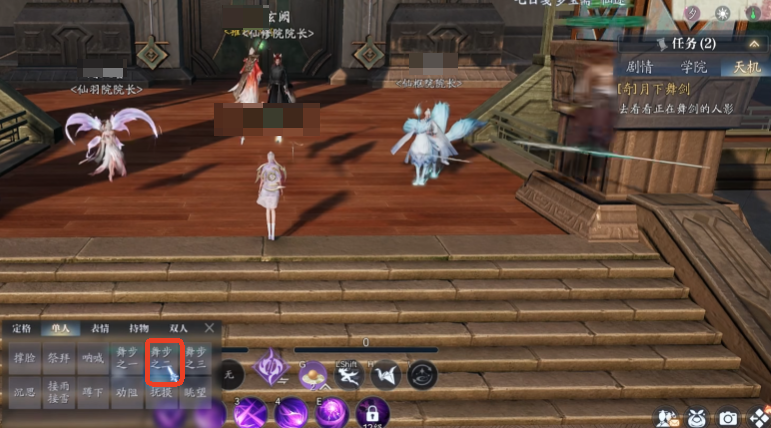 4.长袖善舞,坐标大约(16539,17403)的位置,玉清殿的门口,在玄阙大人的面前做出跳舞的动作,这里选舞步之二。