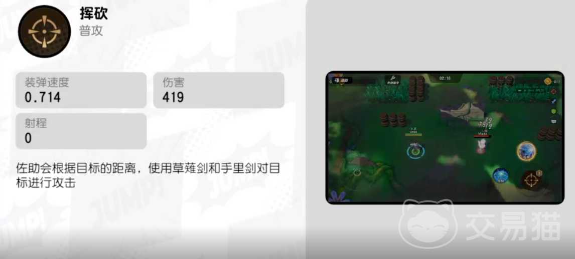 佐助的普攻比较特殊有两种攻击手段,会根据敌方与自身之间的距离,来使用草薙剑或者手里剑对目标进行攻击,近身会使用草薙剑,这个武器挥砍有一定范围并且还伴随击退,远程用手里剑,能打出较远且精准的攻击。