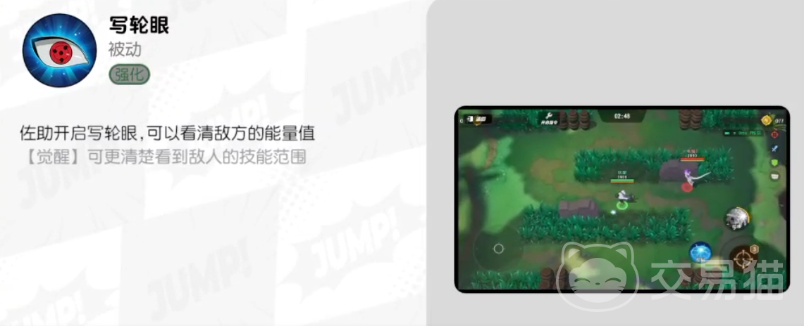 他的大招“千鸟”会快速向着敌方进行突进,并带来一段伤害,觉醒后可以增加突进的距离,天赋能帮助在突进的时候,若沿着墙体则可以滑行一段距离,他的被动会开启自己的写轮眼,此时将能直接看到对方的能量值,觉醒后可以更清楚看到敌人的技能范围。