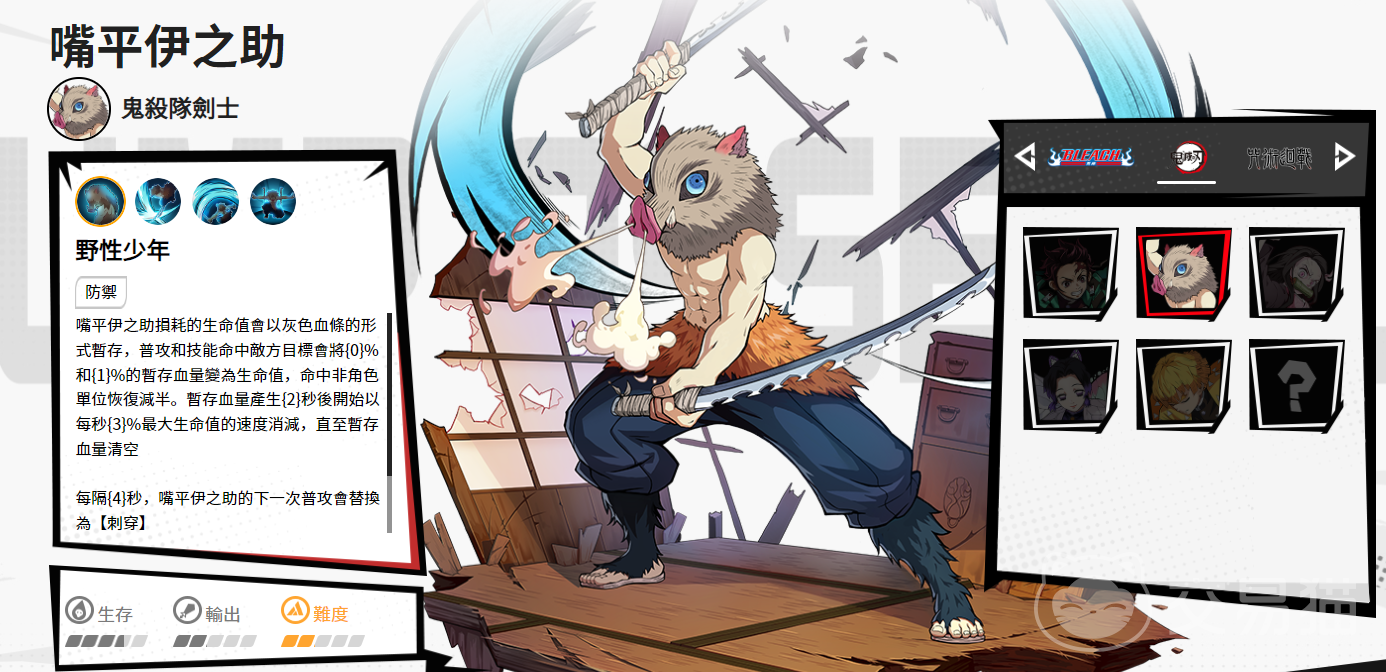嘴平伊之助在《漫画群星大集结》中被明确划分为坦克类角色,与魔人布欧、春野樱等同属游戏中的防御型英雄阵营。作为团队的前排核心,伊之助的设计完美还原了原作中横冲直撞、野性难驯的形象特点,同时通过游戏机制赋予了他极强的生存能力和战场搅局能力。不同于传统意义上笨重迟缓的坦克形象,伊之助的特色在于高机动性的防御机制,这使他在保持足够坦度的同时,还能灵活穿梭于战场,对敌方后排造成持续威胁。从基础属性来看,伊之助拥有全游戏顶尖的生存能力,其生命值成长系数位列所有角色前列。但与其他坦克角色不同的是,他的防御属性并非来自静态的护甲或魔抗,而是依赖独特的动态护盾积累机制。这种设计使得熟练的伊之助玩家可以通过精准的走位操作,将理论上的生存能力转化为实战中的持续压制力。值得注意的是,伊之助的攻击属性在坦克角色中属于中等偏上水平,这让他不仅能够承担伤害,还能在适当时机打出可观的输出。