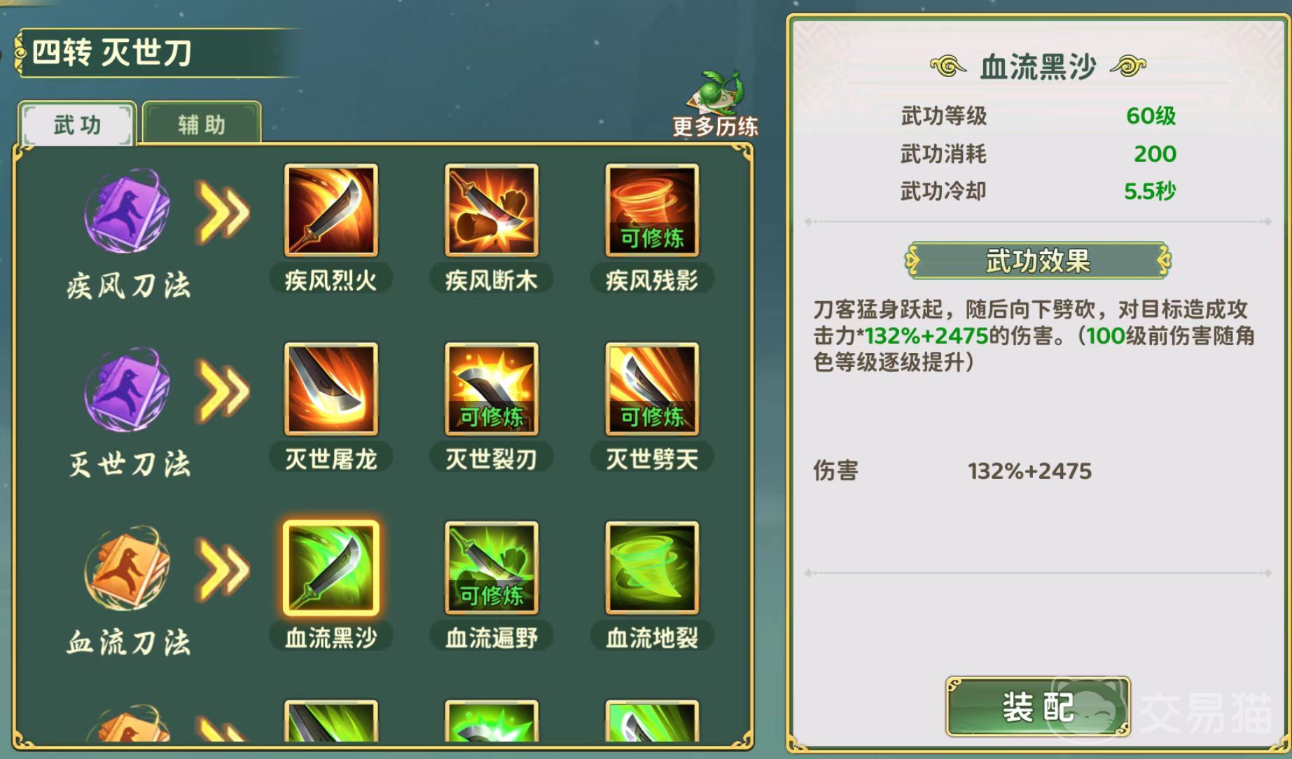 三转的时候补充上暗影绝杀,这个技能根据概率可附加真实伤害,是一个可以无视敌人防御的输出狠招。四转的时候点四两千金和梵音破镜,四两千金能够有概率反弹伤害,梵音破镜有概率追加伤害,但如果资源不够可以先不点,资源多的玩家一定要点上。五转的时候点流光乱舞,可提升武功伤害。这些加点方式主要围绕的就是自身的攻击力和防御力,很好地将刀客的优势发挥了出来。