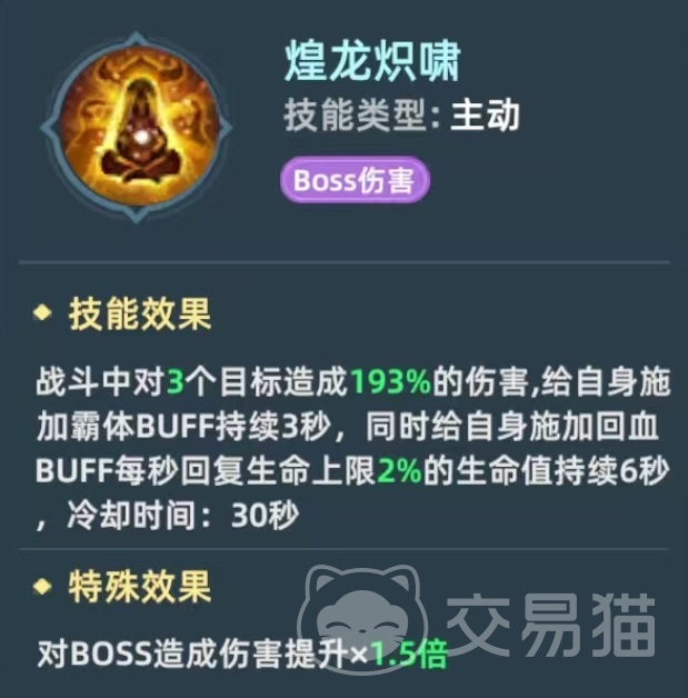 搞清楚技能效果之后,接下来就是最重要的搭配,既然已经确定是属于打BOSS型的宠物,搭配的其他宠物也是属于同一类型。小编有几个比较适合的选项,分别是不灭凤凰、传奇巨鳄、炎魂斗龙。选择不灭凤凰是因为它的核心技能可以对目标造成伤害,并且给自身添加回血buff,每秒钟都可以按照生命上限去回血,这样能够提升整体的续航能力。传奇巨鳄能够在输出时给目标附加定身效果,同时将身上的部分buff清除,对方被定身之后,当然就可以为我方提供更大的输出空间。炎魂斗龙的核心技能能给角色添加上反伤buff,并且给目标施加流血。