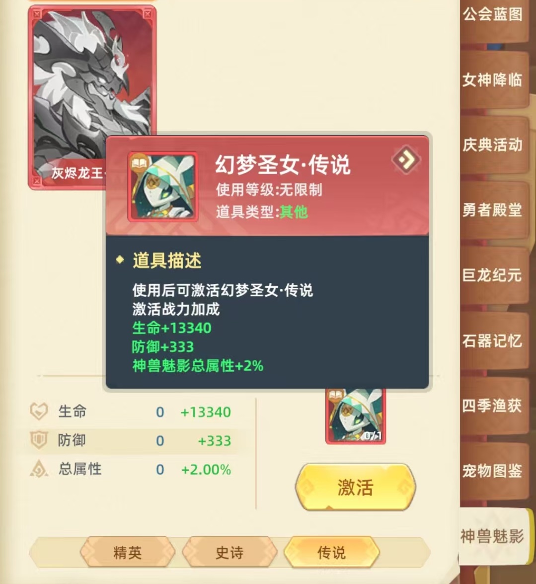 幻梦圣女的核心技能是神灵降临,属于护盾减伤类效果。召唤出魔神进行助战,在战斗中对怪物造成伤害,同时给自身施加一个免疫类型的buff。还能给自身附加一个按照生命值上限计算的护盾。另外还有一个附加pvp减伤的buff,持续10秒钟。特殊效果是在pvp中,对玩家造成的伤害提升,对boss造成伤害提升。所以这是一个无论是pk还是刷怪。都很好用的核心宠物。