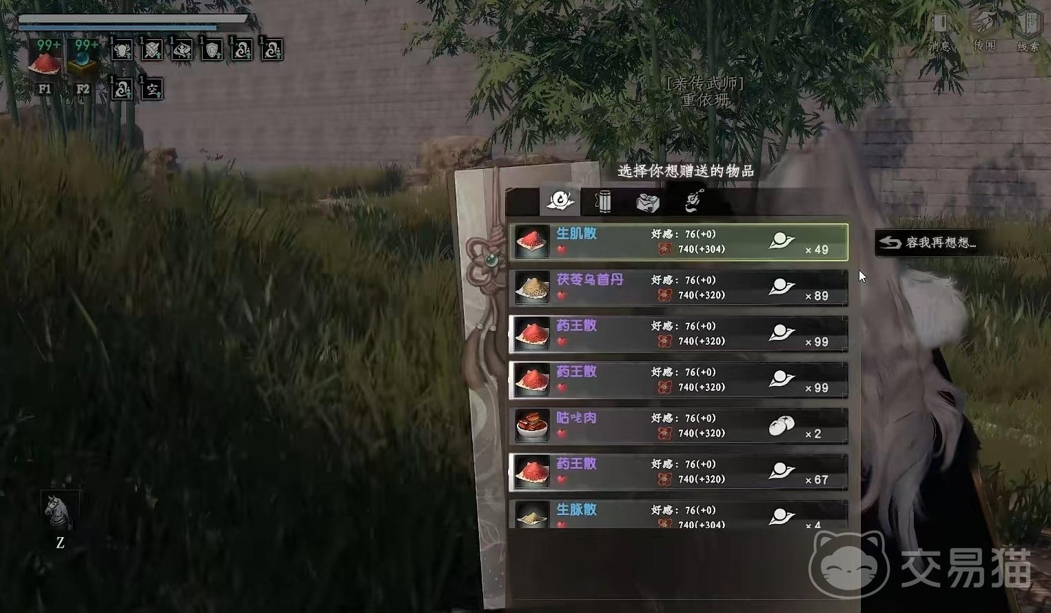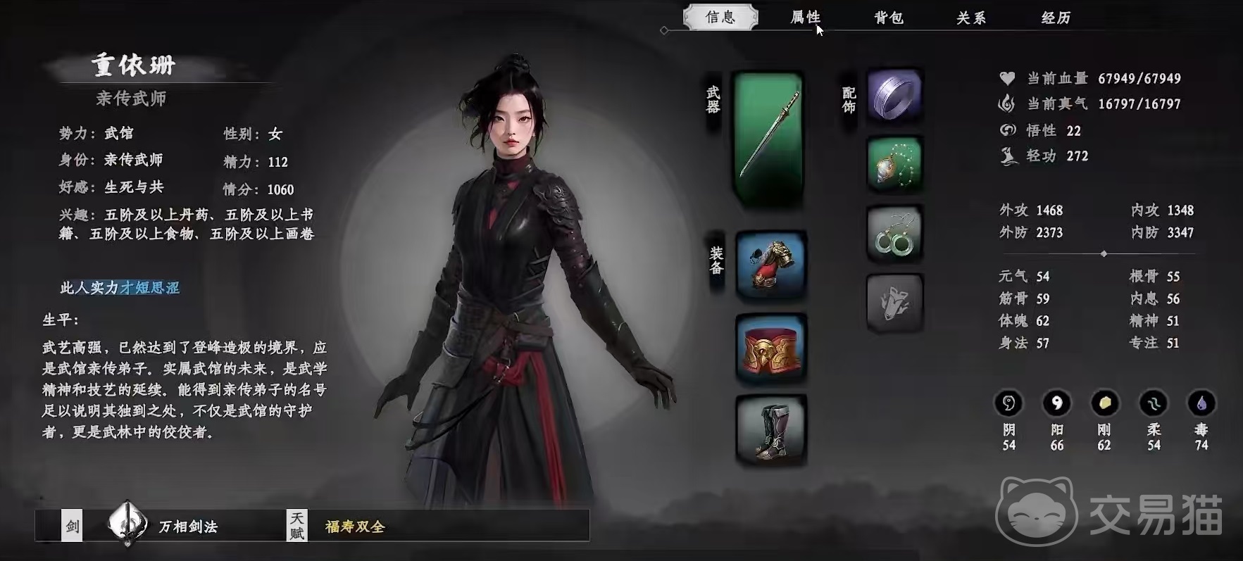 其中重点应该查看兴趣这一项,代表大家需要送哪些礼物,才能获得更高的好感度。然后大家去买对应的礼物,就可以快速的将好感度刷上去了。等到好感度刷到需求的数值之后,就可以直接点击交互,然后选择拜师,这样就可以成功拜对方为师了。这里有一个条件是好感度达到50,情义值达到3500就可以拜师,但有些时候满足条件也未必成功拜师,这时就需要多尝试几次就可以了。拜师之后直接选择请教,学习他的秘传绝技,秘传绝技其实就类似于被动,不同颜色的绝技需要的情分值不同。