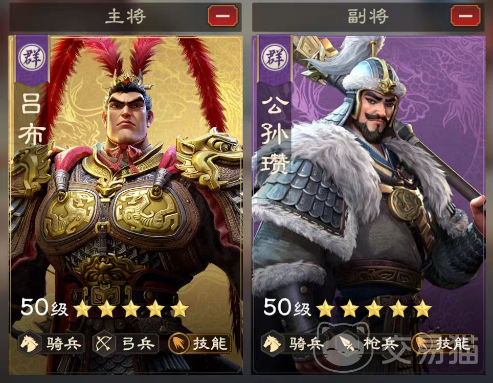 第2套推荐的阵容是吕布和公孙瓒一起出场,公孙瓒获取更加简单,所以成型更容易。兵种选择禁军,阵法依然是双龙阵。公孙瓒虽然是紫色武将,但是自身的被动可提升队伍技能伤害和暴击率,怒气技能附带击退效果,很契合吕布的技能机制。这套阵容适合前期开荒使用,后续将公孙瓒换成貂蝉就可以愉快转型。