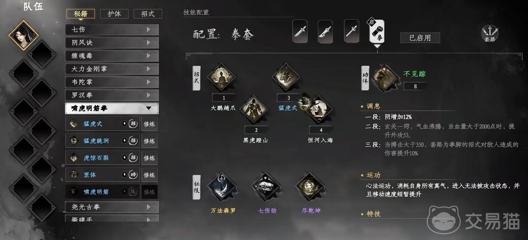 第6种是啸虎明筋拳+初始拳,可增加降龙和伏虎的威力。第7种是断海八式+明禅拈花指,融合之后大幅度提升搏击招式的威力。第8种是玉川指+明禅拈花指,效果是引煞能够大幅度消耗目标的内息和元气。第9种是惊武回风拳+啸虎明筋拳,效果是能够按照当前的根骨来回血,还能大幅度提升筋骨属性和根骨属性,并且能反弹敌方造成的伤害。