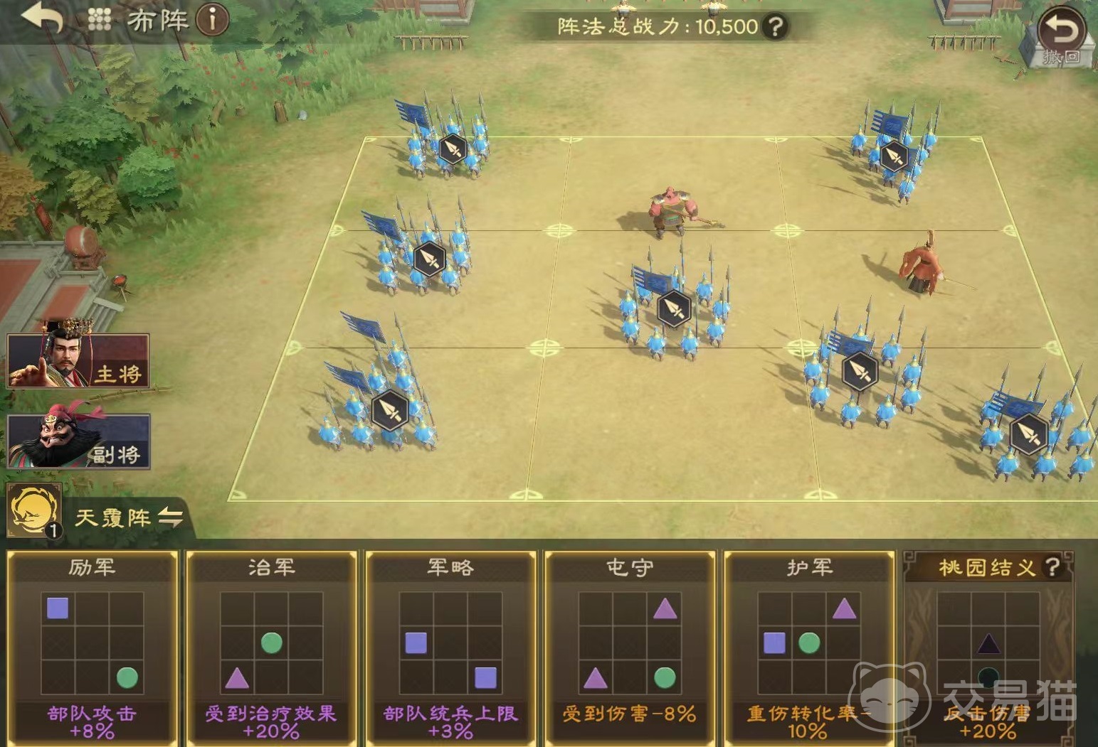 在阵法方面首选天覆阵,天覆阵是最契合刘备机制的阵法,在部队释放技能后,由有机率提供治疗,与刘备一起形成多治疗的机制联动,更好地维持部队兵力稳定。还有一种搭配方式是刘备和诸葛亮一起组合,这二人激活的羁绊是三顾茅庐,能提升统兵上限。刘备提供续航和高额减伤,进一步提高队伍容错,只要时间足够长,诸葛亮依靠自身的技能特性可打出高额输出。