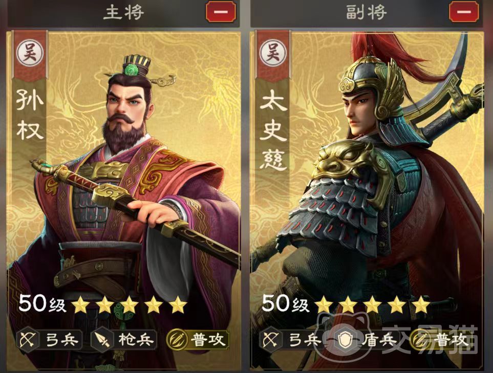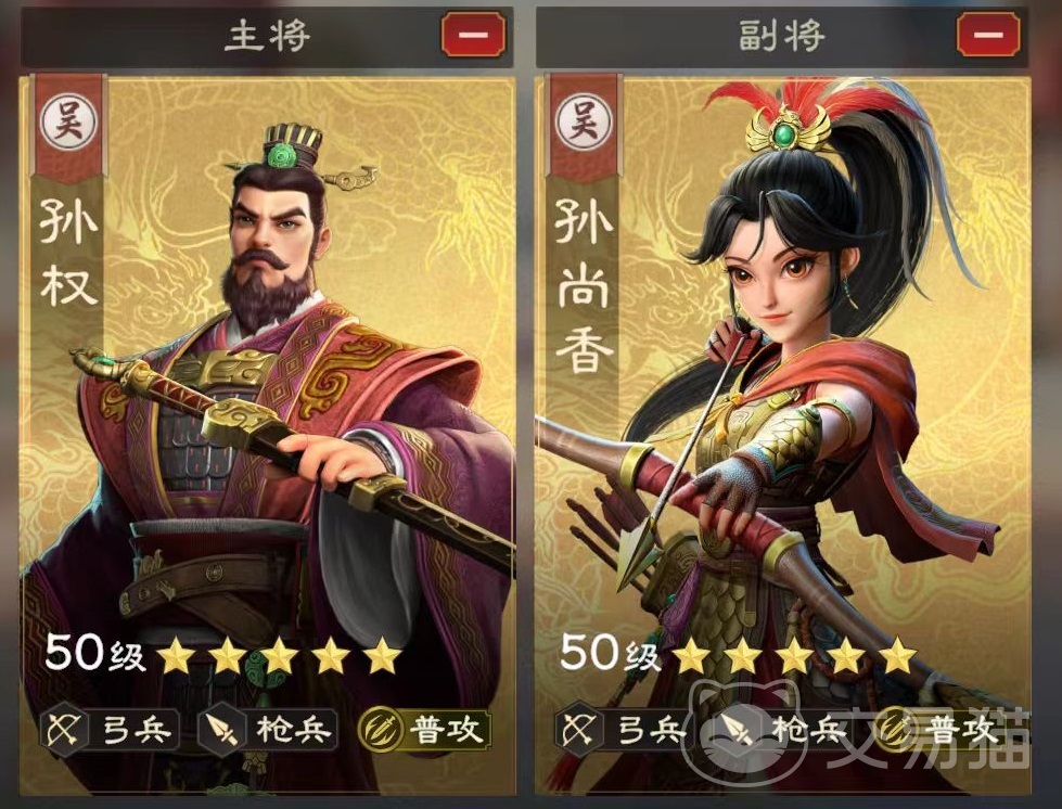 具体武将搭配方面,最推荐的就是兄妹暴击弓,主将孙权,副将孙尚香。如果没有孙尚香,抽到紫卡孙策之后也能进行替代。具体操作是在孙策练度比较低的时候走枪兵路线,主打持续作战,在提高练度之后就切换为弓兵配置,利用弓兵的优势和孙尚香带来的攻击力加成效果,做到双核搭配快速爆发。还可以搭配上太史慈,太史慈能提升弓兵单位的攻击力,还有普攻暴击率、爆伤、倒戈率等一系列加成,和孙权也比较贴合。