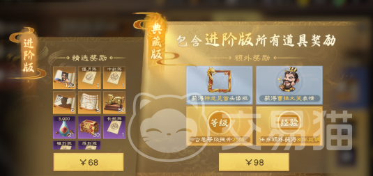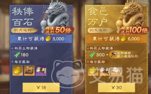 如果预算达到68元,那么此时就可以参与累计充值活动,获得对应的礼包。例如大家购买的是通行证,那获取的礼包中就有40张夏侯惇百将谱,要知道这一个角色的实力还是很不错的,首先抗伤反击的能力很出色,适合作用于开荒使用。到了后续环节提升通行证的等级,那还可以累计拿到120章,可以让武将的技能迅速的提升。其实月卡也可以获取礼包,主要是分成两个档位,一个是18元,一个是30元。18元的档位,30天内就可以累计获得30次招募机会还有3000金珠。