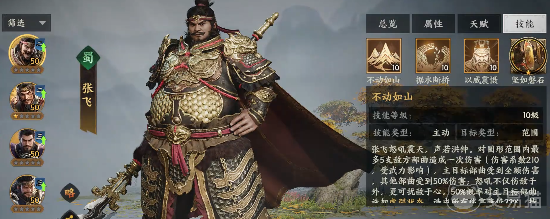 张飞在《三国群英传:策定九州》中定位为控制型输出武将,属于通过主线任务或特定活动即可获取的初始武将之一。其技能组完美还原了历史上"万人之敌"的特点,兼具群体控制、防御削弱与高爆发输出三大功能。主动技能"不动如山"是张飞的核心技能,效果为:对敌方全体造成50%攻击力的伤害,并有60%概率施加持续2回合的"眩晕"状态,同时为目标附加"虚弱"效果(降低15%防御力,持续3回合)。该技能的控制效果在盾兵中极为罕见,群体眩晕可有效打乱敌方阵型,而防御削弱则能为后续输出创造有利条件。技能等级提升可增强控制概率和伤害系数,建议优先升级。二技能"据水断桥"为被动效果,当张飞兵力低于50%时,自身攻击力提升25%,并免疫控制效果(冷却时间45秒)。这一技能使张飞在残局中具备更强的反打能力,攻击加成数值在同类武将中位列前茅,尤其在PVP对抗中表现突出。