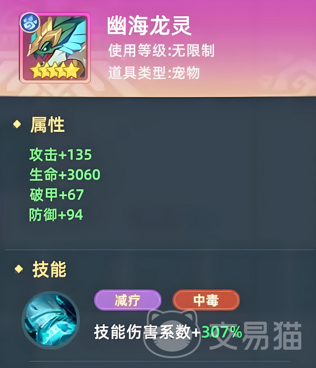 所以说能够进行禁疗和中毒,是这个宠物的最大特点,还有一个特殊效果是在pvp中对玩家目标造成伤害为1.5倍。后续在升星之后伤害还能进一步增加,但最主要的是利用自身的减少治疗效果,克制对方的回复型阵容,再利用其中毒带来的持续伤害,在很多长时间战斗中打出输出。因为自身是属于绝对的pvp宠物,阵容搭配的时候也是以pvp为主,小编推荐配合猎鹰剑豪和熔晶岩龙一起组成阵容。