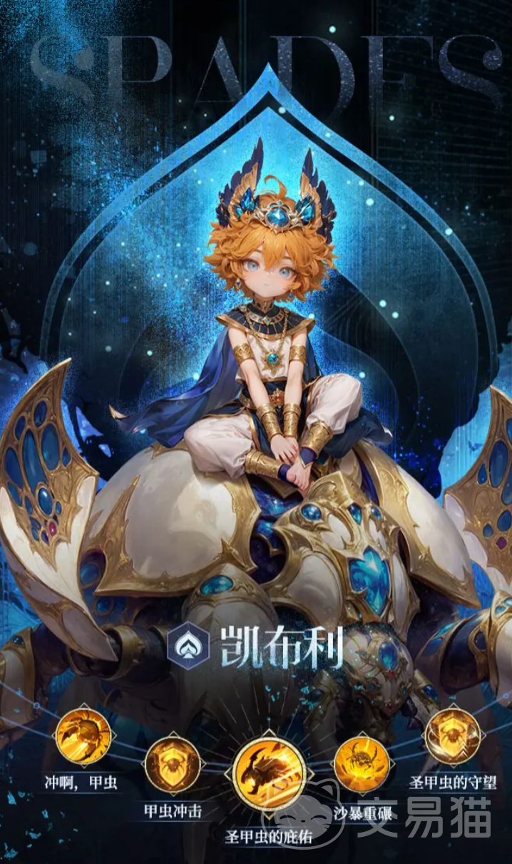 凯布利技能设计独特。普通攻击看似常规,却为后续技能衔接打基础。技能一圣甲守护,释放时周身环绕金色光芒,获能吸收大量伤害的护盾,技能二日光冲击,向前方释放日光射线,覆盖前方约120度扇形区域,对敌人造成攻击力80%的伤害,大招轮回破晓,能量蓄满后召唤圣甲虫战车向前冲锋,对直线敌人造成200%巨额伤害,清除自身负面状态,为队友恢复凯布利最大生命值10%的血量。