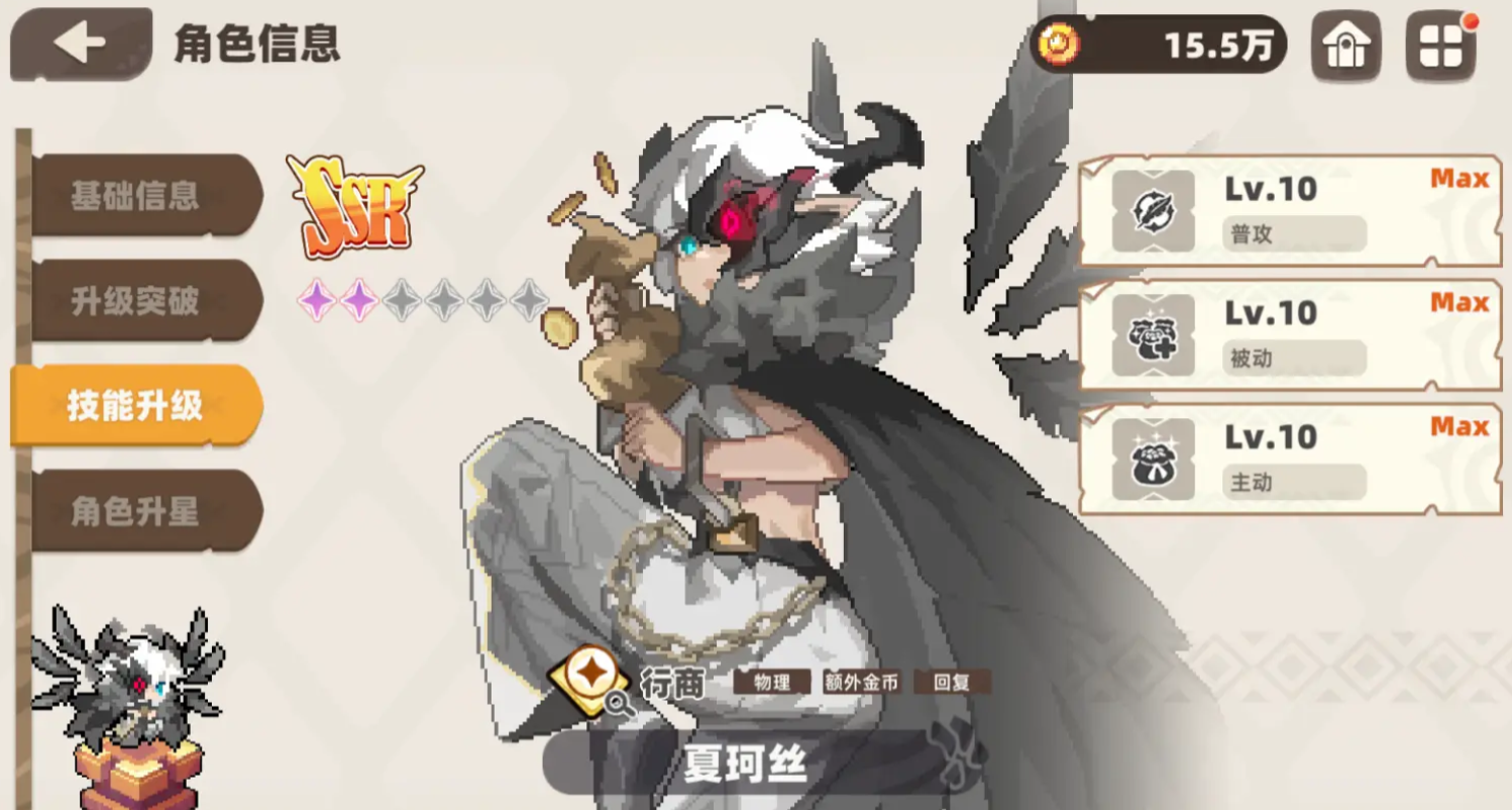 夏珂丝属于是打钱角色,她的普攻能直接标记上敌人,并且可以和其他角色一起得到增益,有她在我们关卡内获得金币的数量将大幅提升,属于是各个关卡中都必带的角色。