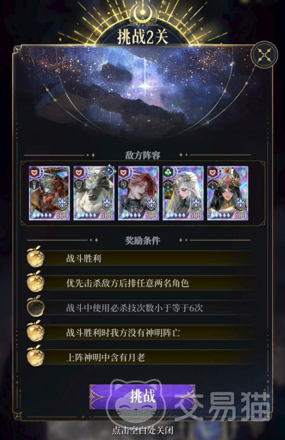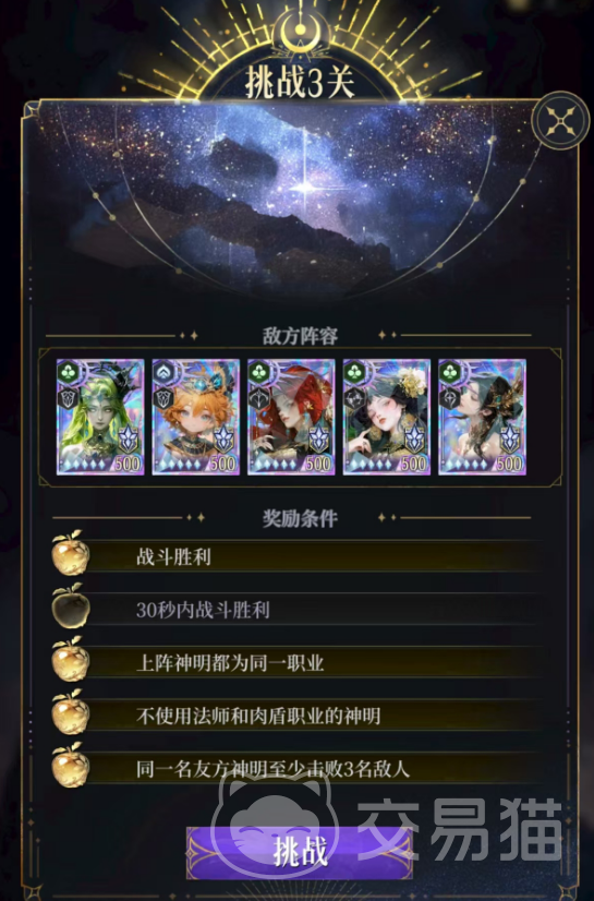 以第二关为例,条件包括:优先击败敌方后排的两名角色、使用必杀技不超过6次、保持己方无阵亡,并且阵容中必须包含月老。要达成这些要求,需要安排高爆发的输出角色快速切入敌方后排,同时依靠防御型角色或辅助角色保证队伍生存。再看第三关,它要求在30秒内结束战斗,参战角色必须为同一职业,并且不能选择法师和肉盾,同时还要让一名神明单独击杀三名敌人。这类关卡明显偏向单核输出,队伍中需要有一个强力的主C,其他角色则以辅助和增益为主,帮助主C完成击杀。