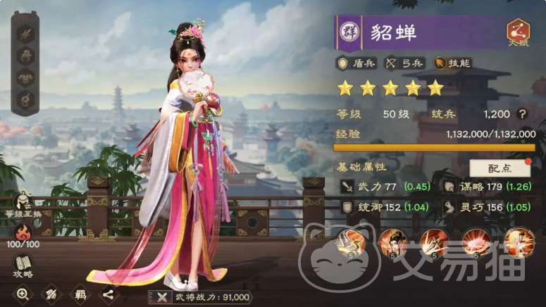 然后貂蝉就是一个经典的辅助,貂蝉的怒气技能极具特色,她会向前挥动鞭影三次,每次鞭梢所及之处敌人都会受到一次精准打击并被高高击飞,连续三段的击飞效果足以在短时间内限制住敌人的行动,她的被动技能积谷会为主将提供高达30%的抗震率加成,降低了主将在承受攻击时的硬直风险,与此同时还能使得主将与副将的招式暴击率飙升40%,提升队伍的整体输出效率,另一项被动寒蝉会全方位强化队伍的各项伤害数据。