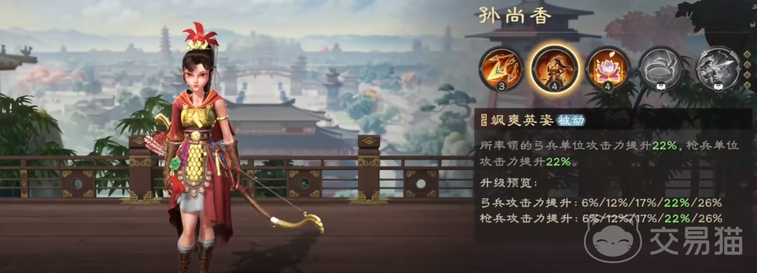 孙尚香在《偃武》中的定位是普攻流专属副将,其核心价值不在于个人输出能力,而在于为团队提供的穿透率加成和反击伤害减免效果。从初始面板来看,孙尚香的武力、统御和灵巧数值都较为普通,这容易让新手玩家低估她的实际价值。然而,当她的被动技能达到较高等级后,将为弓兵队伍带来质的飞跃,尤其在持续作战场合表现突出。孙尚香的技能升级优先级为:巾帼英雄>蕙心纨质>怒气技>飒爽英姿。必须将两个核心被动提升至较高等级(建议至少3级),才能充分体现她的构筑价值。在初期白板阶段,若有其他优质武将可暂不使用孙尚香,待技能等级提升后再投入资源培养。从星级成长来看,孙尚香属于后期发力的战术型武将。低星级时效果有限,但随着觉醒和技能等级提升,她在普攻流阵容中的地位会大幅提高。特别是在持续作战场景中,高星孙尚香提供的穿透加成能使弓兵队伍在减少战损的同时打出稳定而高额的暴击伤害。
