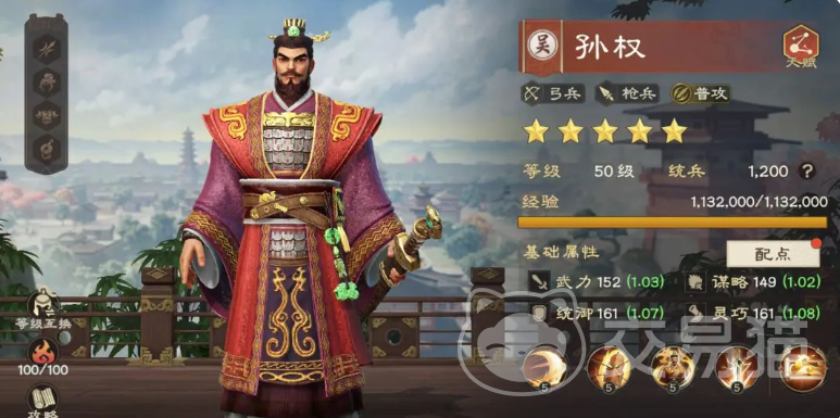 谈及吴国的输出核心,非孙权莫属,这位君主级别的人物,各项数值较为均衡全面,尤其依赖普攻进行持续稳定的输出,他的剑驭天下技能挥剑之间,释放出多道剑气,每一道剑气都能对单体敌人造成可观的伤害,并附带多段击退效果,虎孙郎技能则为弓兵与枪兵带来增益,提高了他们的生命值上限,使得这些远程输出单位能够在战场上存活更久,而紫气黄龙技能则是他的主要伤害来源,该技能能够大幅提升普攻暴击率,让每一次普通的挥砍都有可能化作暴击,此外虎距江东技能还赋予了他动态的战斗适应性,当血量高于50%时,抗性随之上升,当血量低于50%时,伤害则会进一步提升。