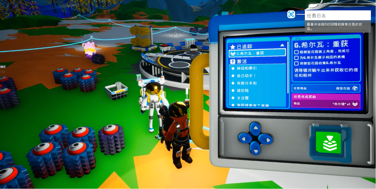 蜗牛的收集任务很多,我们看看西尔维任务流程,玩家要先寻找到5个G.希尔瓦壳,然后对着它长按F进行扫描。接着在微型花园放入一罐土、锌和跳藤种子。在希尔瓦星球进行蜗牛收集相关任务时,玩家需要先把从微型花园任务中获得的奖励——小型喇叭放置在微型花园上面。放置好之后,要站在蜗牛面前,连续跳上两次舞蹈,将视角对准微型花园,长按F键,这样就能把眼前的小蜗牛成功吸入到微型花园之中,完成这一阶段的收集步骤。