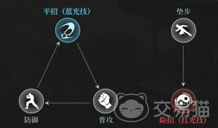 体力在战斗时比较重要,一些操作需要使用体力,比如垫步,强制脱出,强制取消。角色可通过垫步进行灵活移动,躲避攻击或与敌人灵活拉扯,需要使用1格体力,在被对手攻击命中瞬间使用,还能触发“极限闪避”。防御主要是用来防守对方的平招。这些招式之间存在相互克制关系,放在上图当中。这些基础操作都是大家初步需要掌握的,可在训练处多多练习,熟悉基本战斗技巧。