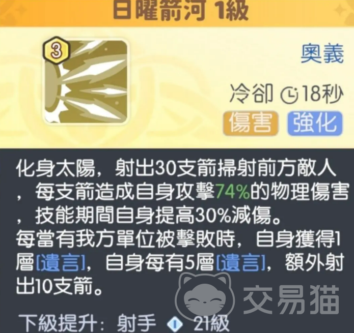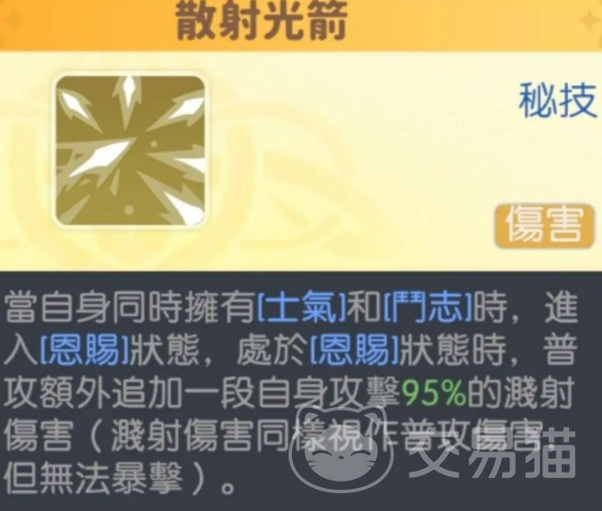 在特技方面,阿波罗的“散射光箭”能够在她同时拥有“士气”和“斗志”状态时,进入“恩赐”状态。在这个状态下,她的普通攻击将会额外追加一段溅射伤害,虽然无法暴击,但95%的攻击力溅射伤害可以大大提高她在群体战斗中的输出效率,帮助她快速清理敌方单位。